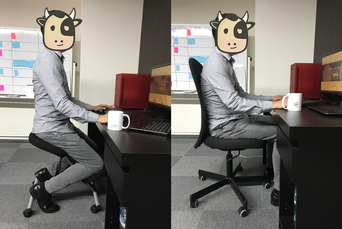 とはいえ、ものすごく座り心地が良いというわけではありません。姿勢を保つためにある程度の筋肉を必要とするし、膝は常に曲がった状態なので、ある一定の間、座っていると体を動かしたり、足を伸ばしたくなります。そんなタイミングこそ、スタンディングデスクを使い立って作業をするか、もしくはスタンディングデスクを持っていない人は作業を一旦中断してオフィスや部屋を歩き回る休憩タイムにすると良いと思います。メリハリをつけることができて仕事の集中力が増しますよ。
